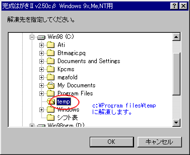 解凍が始まり、どこに解凍したファイル(フォルダ)するか問い合わせのダイアログが表示されます。 | |