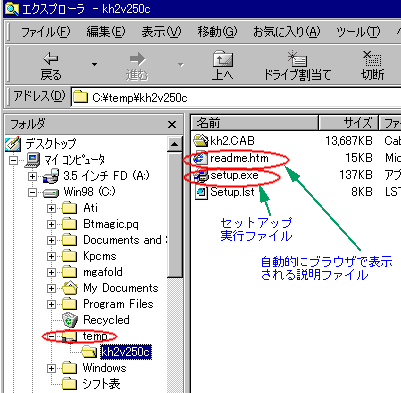 解凍が完了すると、4つのファイルが展開されます。このうち、readme.htmファイルがブラウザによって自動的に表示されます。 インストールパッケージに梱包されているreadme.htmまたはreadme.txtをご覧下さい。 |
