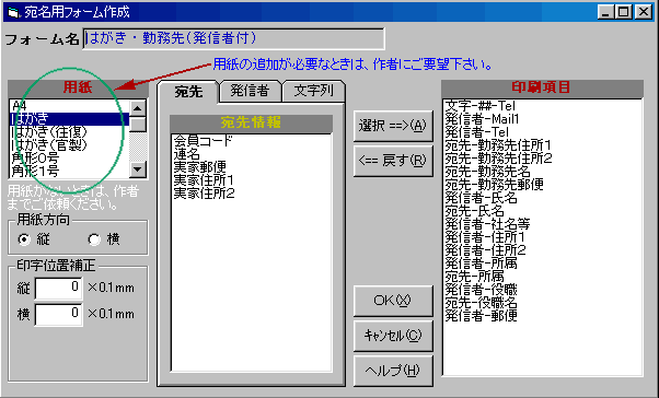 住所録データベースに登録されている項目で、印刷対象となる項目が表示されます。印刷したい項目を選択し、「選択」ボタンを押すと右側のリストボックスへ移動します。