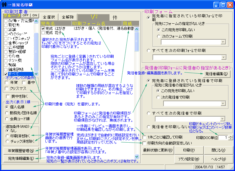 どの宛先をような書式で印刷するかは、印刷フォームで指定します。印刷フォームは、標準ではそれぞれの宛先ごとに登録・編集画面で登録されているデフォルトの印刷フォームを使いますが、デフォルトを無視して別の印刷フォームを指定することができます。複数の印刷フォームが混在していてもかまいません。たとえば、年賀状印刷で私的なものと業務上のものと一括して印刷する場合などがその例です。
