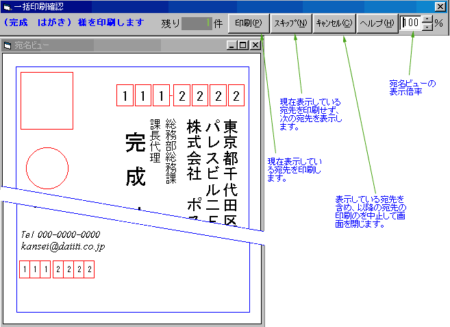 「1件毎に確認して印刷」のチェックがオンの場合下記の画面が表示された後、待機状態となります。「印刷」ボタンを押下すると、表示中の宛先1件だけが印刷され、再び待機状態となります。「印刷ボタン」を押すたびに1件づつ印刷されます。キャンセルボタンを押下すると、表示中の宛先の印刷は行われず、次の宛先が表示され待機状態になります。