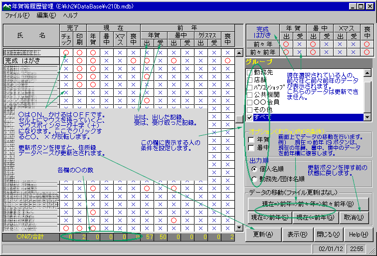 ・「完了」欄「印刷」は、宛先印刷を行うと自動的に○になります。「チェック」欄は、印刷結果をチェック後手動でON/OFFします。この両項目は「