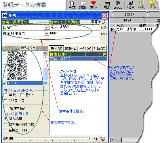 登録してある宛先データの検索を行います。 検索する値は3つまで指定でき、それぞれの「条件のすべてが成立する(AND演算子)」か「どれかの条件が成立する(OR演算子)」が指定できます。 ここで検索できるのは、宛先データのみで贈答データについてはできません。