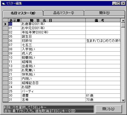 ・一覧画面の「編集(E)」−「マスター編集(M)」−「贈答関連マスター(Z)」ボタン。