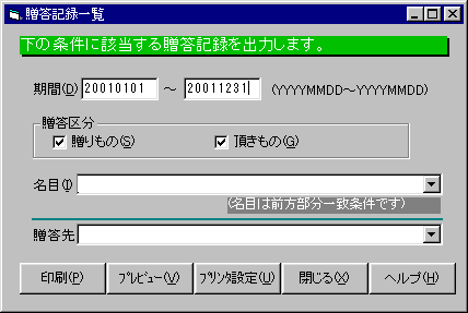 贈答の期間です。この日付は贈答番号の上位10桁と比較されます。ここで指定された範囲にあるものが印刷対象となります。省略すると全てが対象になります。